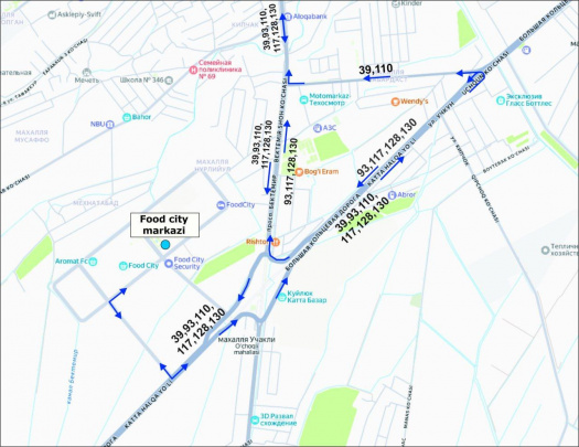 Унга кўра, бир томонлама ҳаракат: 2-, 9т-, 13-, 17т-, 56-, 113-йўналишлар — Фарҳод, Катта Хирмонтепа, Ширин кўчалари орқали.