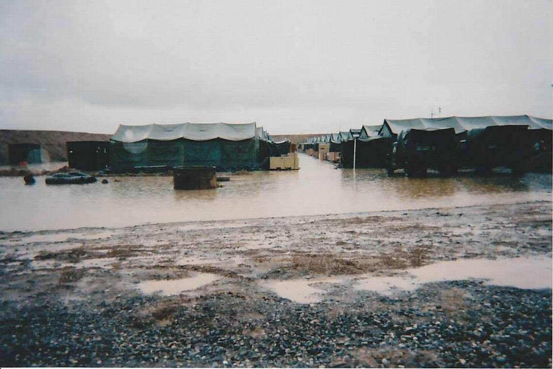 Қарши-Хонобод авиабазасида кучли ёмғир натижасида сув остида қолган чодирлар. Фото: Tony Harris