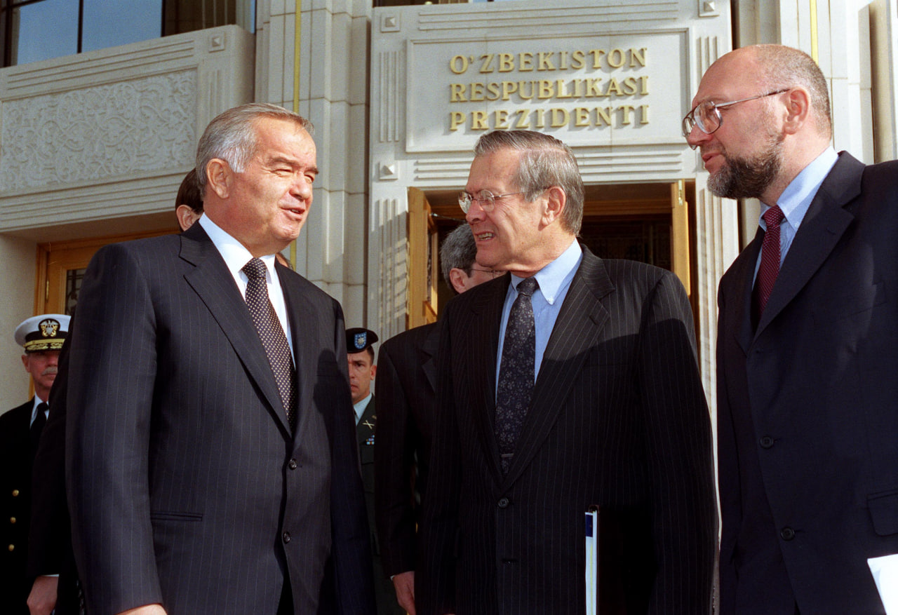 Доналд Рамсфелд (ўртада) ва Ислом Каримов (чапда) Тошкентдаги учрашувдан сўнг.