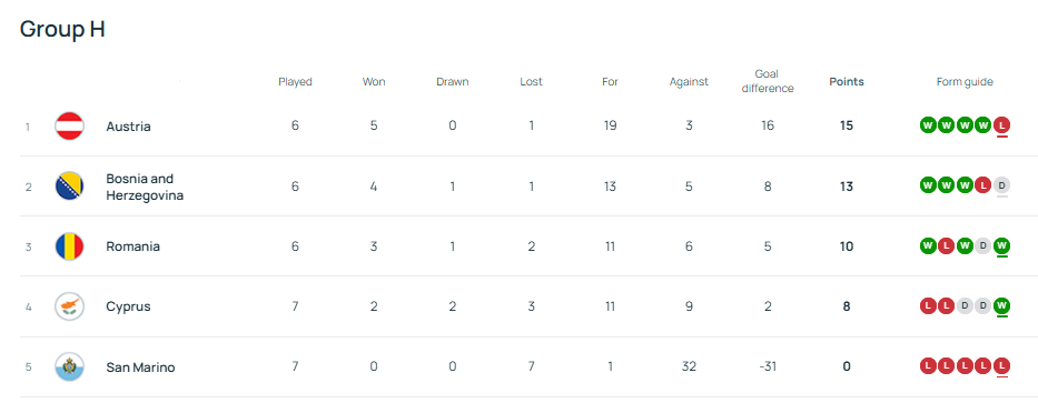 80 ёшли Мирча Луческу бошқарувидаги руминлар кутилмаганда Ралф Рангник бошқарувидаги гуруҳ пешқадамини мағлуб этди. Биринчи бўлимда жамоалар ўта зерикарли ўйин намойиш этишди ва дарвозаларга бирорта зарба кузатилмади. Иккинчи бўлимда эса очко кўпроқ керак бўлган мезбонлар фаоллашди. Аввалига Михэйлэнинг зарбаси устунга борди, кейин эса Шлагер Рациунинг ўта мураккаб зарбасини қайтаришига тўғри келди. Ва якунда барибир руминлар ўз мақсадига эришди, ўйинга ҳакам томонидан қўшиб берилган дақиқаларда Янис Ҳажи Гицэни голли пас билан таъминлади. Австрия дурангга ўйнагани учун жазоланди ва энди иккинчи ўрин ҳам кафолатланмаган. Аммо тақвим уларда осонроқ, ноябрда Руминия Босния билан ўйнайди, Австрия эса ҳеч қандай мотивацияга эга бўлмаган Кипр майдонида йўлланмани расмийлаштириши мумкин.