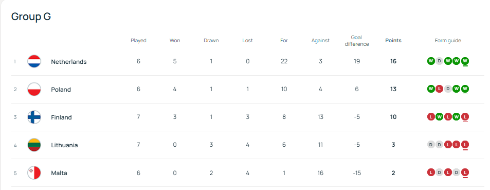 Ўйин охирларида эса Коди Гакпо финнларни яна бир бор ранжитди. Нидерландлар жаҳон чемпионати йўлланмасига янада яқинлашди. Роналд Куман шогирдлари 6 ўйинда 16 очко тўплаган ҳолда биринчи ўринда (тўплар нисбати 22:3). Олдинда Полшага қарши муҳим сафар ўйини кутмоқда.
