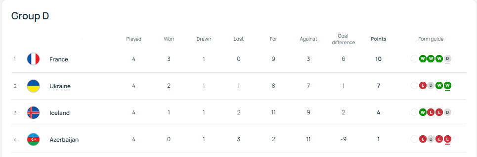 Мезбонларнинг голлари орасида Нкунку ва Матета барибир ўз мақсадига эришди, аммо ҳисоб тенглашганидан кейин бошқа ўзгармади. Натижада французлар муддатидан олдин йўлланмани ҳал қила олмади, шу билан бирга, гуруҳда қизиқ интрига юзага келди, биринчи навбатда – иккинчи ўрин учун курашда. Украина ҳозирда Исландияни уч очколик фарқ билан ортда қолдирмоқда, лекин украинлар кейинги турда Франция билан, Исландии эса Озарбойжон билан ўйнайди, охирги турда эса ўзаро ўйин бўлиб ўтади (катта эҳтимол билан, ўша ўйинда ғолиб чиққан жамоа ўтиш босқичига йўл олади).
