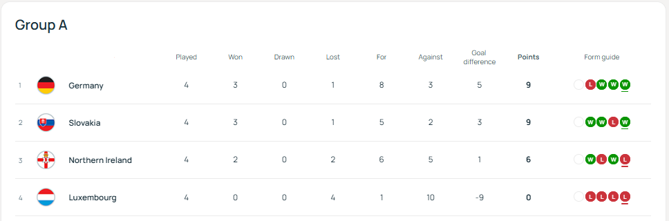 Люксембург ва Словакия ўйини эса икки томондан ҳам кулгили хатолар билан ёдда қолди. Аммо Дардари мезбонларни жазолай олмади, унинг яккама-якка вазиятга чиқиб бориб йўллаган зарбаси хато кетди. Люксембургликлар дарвозабони тўпни рақибга совға қилганида эса Дуданинг зарбаси устунга тегди. Лекин словаклар етакчиси иккинчи бўлимда айбини ювди. У бурчак зарбасини ижро этатуриб, кутилмаганда тўпни жарима майдонига ерлатиб етказди ҳамда Обертнинг ҳисобни очувчи голига ассистентлик қилди. Иккинчи бўлим давомида Шранц яқин бурчакка кучли зарба йўллаб, ўйин масаласини ҳал қилди. Люксембургликлар муносиб қаршилик кўрсатиб, рақиб дарвозасига етти бор зарба берди, аммо бу зарбаларга аниқлик етишмади. Энди Словакия худди Германия каби 9 очко тўплаб, фақат тўплар нисбатига кўра иккинчи ўринга жойлашган, аммо жамоанинг қолган икки турдаги рақиблари қийинроқ – аввалига уйда иккинчи ўрин учун рақобатчи Шимолий Ирландияга қарши, охирги турда эса сафарда фаворит Германияга қарши ўйинлар кутмоқда.