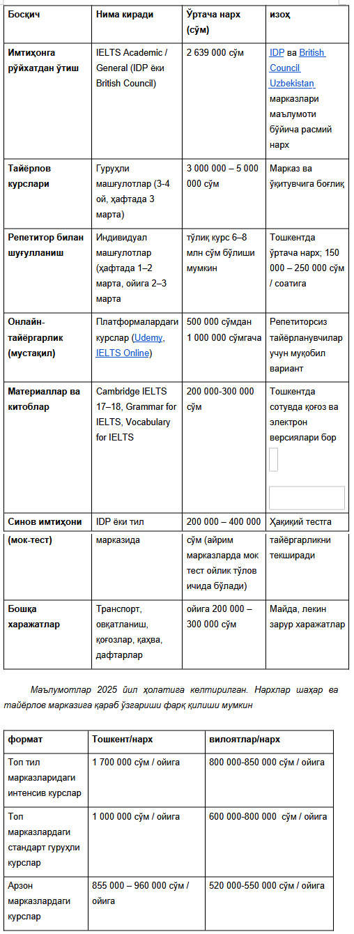 British Council маълумотига кўра, имтиҳон нархи (Academic ёки General Training) — 2 639 000 UZS.