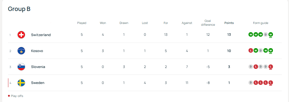Швейцария беш ўйинда 13 очко тўплаган, аммо ҳозирча худди испанлар каби йўлланмани расмийлаштирмади: асосий таъқибчи Косово уч очколик фарқ билан таъқиб қилмоқда, аммо тўплар нисбатидаги фарқ жуда катта (+11). Швеция эса Миллатлар лигаси орқали ЖЧ-2026 учун йўлланма олишга ҳаракат қилади.