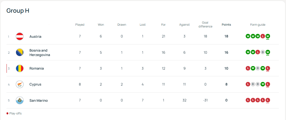 «11 га 10» форматида Босния ва Герцеговина Руминияни аяб ўтирмади: Эсмир Байрактаревич ўнг қанотдан ҳужум уюштирди ва кучли зарбаси билан дарвозанинг чап тўққизлигини аниқ нишонга олди. Ўйинга қўшиб берилган дақиқаларда эса Харис Табакович якуний ҳисобни ўрнатди. Энди боснияликлар тўғридан тўғри йўлланма учун сўнгги турда Австрияда ғалаба қозониши керак бўлади. Учинчи ўриндаги Мирчи Луческу шогирдлари эса Миллатлар лигасидаги рейтинги эвазига ўтиш ўйинларида қатнашади.