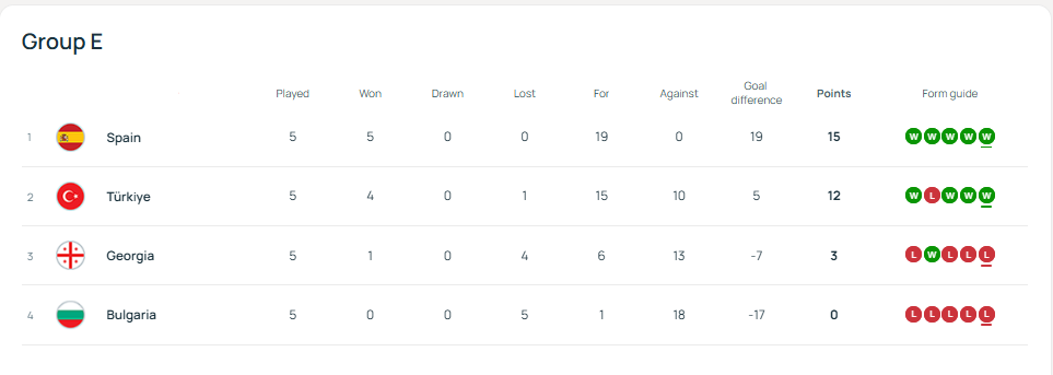 Испания ҳам худди Англия каби бу сафарги саралаш турнирида битта ҳам гол ўтказмаган (19:0), лекин инглизлардан фарқли ўлароқ, ҳали ҳам ЖЧ-2026 учун йўлланмани расмийлаштирмади. Бунинг сабаби эса Туркия.