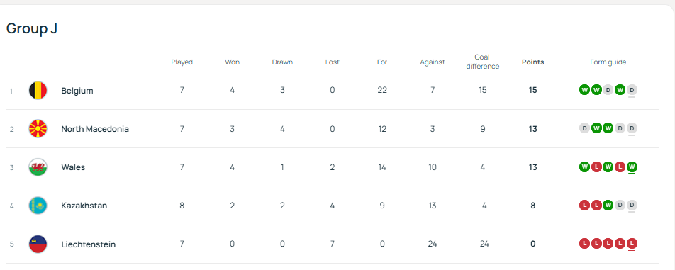 Белгия ва Қозоғистон ўртасидаги биринчи ўйин мезбонларнинг йирик ҳисобдаги ғалабаси билан якунланганди (6:0). Айнан шу натижадан кейин Али Алиев қозоғистонликлар бош мураббийи лавозимидан бўшатилди, унинг ўрнига иш бошлаган Талгат Байсуфинов бошчилигидаги жамоа эса Лихтенштейнни йирик ҳисобда мағлуб этди (4:0), гуруҳ пешқадамларидан бири Шимолий Македонияга ютқазмади (1:1), энди эса гуруҳнинг асосий фаворитига ҳам жанг таклиф этди.