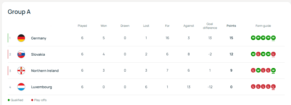 Мезбонлар биринчи бўлимдаёқ тўртта гол уришди, Ник Волтемаде терма жамоадаги қаторасига учинчи ўйинда номини таблога ёздириб қўйди, «Галатасарой» дубли Лерой Сане дубл қайд этди, Серж Гнабри, Ридле Баку ва 19 ёшли Ассан Уэдраого (дебют ўйинида ва майдонга тушганидан икки дақиқа ўтиб) биттадан гол уришди. «Ливерпул»да мослаша олмаётгани учун танқидга учраётган Флориан Вирц Саненинг икки голига ассистентлик қилди. Германия 1954 йилдан буён узлуксиз равишда жаҳон чемпионатларига чиқиб келмоқда ва 2026 йил ёзида ҳам катта натижаларни кўзлаган. Словакияда ҳам жаҳон чемпионатига йўлланма олиш учун имконият сақланиб қолмоқда. Аммо бунинг учун ўтиш ўйинларида икки ўйинда ғалаба қозониш керак бўлади.