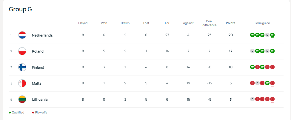 Ўтган турда поляклар билан ўйинда дуранг қайд этиб, муддатидан олдин йўлланмани ҳал қила олмагач, нидерландлар устози Роналд Куман танқидлар остида қолганди. Чунки назарий жиҳатдан, сўнгги турда жамоа биринчи ўринни бой бериши мумкин эди: бунинг учун жамоа Литвага йирик ҳисобда мағлуб бўлиши ва Полша ўз ўйинида йирик ҳисобда ғалаба қозониши талаб этиларди. Амалда эса нидерландлар сўнгги турда хотиржамлик билан вазифани ҳал қилди.