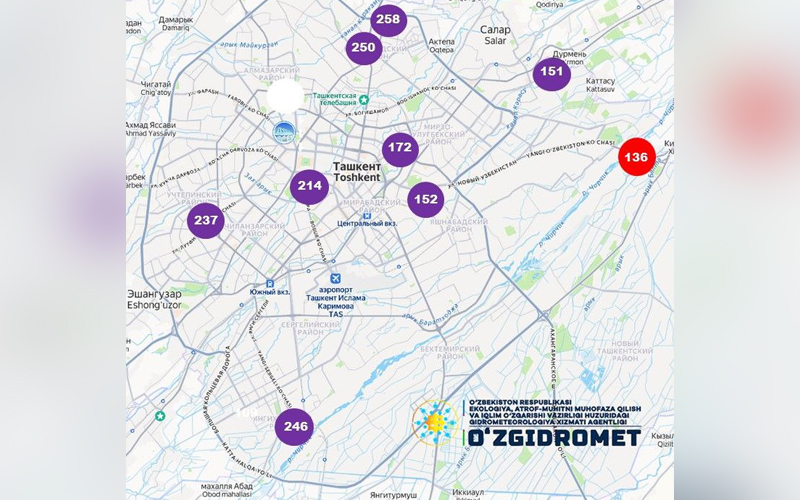 2025 йил 20 ноябр куни соат 09:00 ҳолатига кўра автоматик мониторинг станциялари маълумотларига асосан, Тошкент шаҳри атмосфера ҳавосидаги PM2,5 майда дисперс заррачалар миқдори рухсат этилган меъёрдан 3,4 баравар юқори қайд этилди. Аҳоли ва меҳмонларга очиқ ҳаводаги фаолиятини чеклаш ва ниқоб тақиб юриш тавсия этилмоқда.