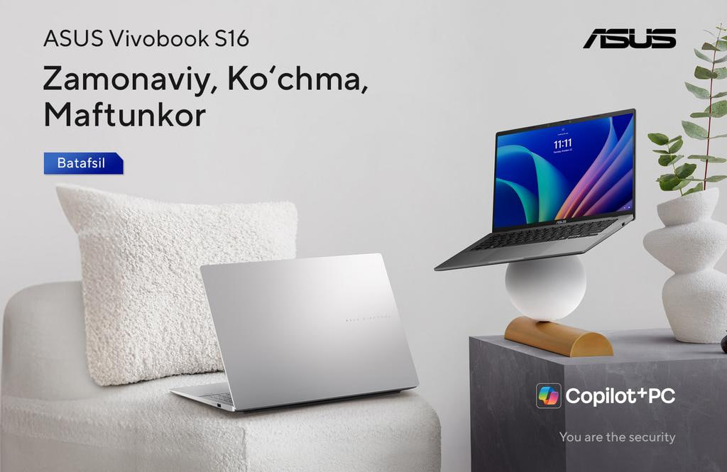 Катта 16 дюймли 144 Гц частотали экран, нозик рамкалар ва замонавий корпус Vivobook S16`ни замонавий ва қулай қилади. Ёритилган клавиатура юмшоқ ва қулай, умумий дизайн эса енгил ва уйғун. Ноутбук офисга ҳам, уй интерерига ҳам осонгина мос келади.