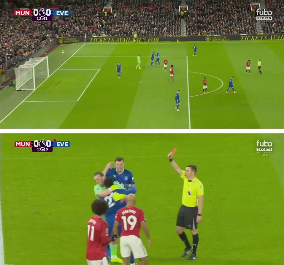 Сардор йўқлигида «Эвертон» футболчилари орасида фавқулодда ҳодиса юз берди. Жамоадошларнинг ўзаро жанжалидан кейин улардан бири майдондан четлатилиши камёб ҳодиса ҳисобланади. Ва «Олд Траффорд»да йиғилган мухлислар айнан шундай ҳодисага гувоҳ бўлишди. Ўйиннинг 13-дақиқасида «МЮ» ҳужуми вақтида «Эвертон» яримҳимоячиси Идрисса Гуйе тўпни эгаллаб олди ва ўз яқинида турган ҳимоячи Майкл Кинга узатди. Аммо ҳимоячи уни тушунмади ва тўпни қабул қилмади, натижада тўпга эга чиққан Бруну Фернандеш хавфли зарба йўллади.