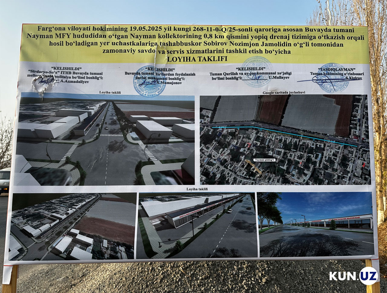 “Найман маҳалласидаги зовурнинг устига енгил типдаги дўконлар қуриш режалаштирилган эди. Зовур тўлиқ ишчи ҳолатда турарди. Хулосалар, техник шартлар олинган. 800 диаметрли қувур кўмилиб, зовур тўлиқ ишчи ҳолатда туриши ва устига енгил конструкцияли дўкон қурилиши режалаштирилган эди. Туман ҳокимининг топшириғига асосан қурилиш ишлари тўлиқ тўхтатилди. Экологияга етказилган зарарлар ҳисобланиб қопланади. Тадбиркор, қурувчи томонидан шошмашошарлик билан қурилиш ишлари бошлаб юборилган, ҳудудни очиб, дарахт кесилган.