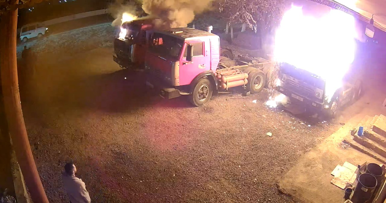 Гувоҳларга кўра, иккита “Камаз” логистика марказидан тахминан бир километр узоқликда сақланган. Аввало ўша икки “Камаз”га бензин сепилган ва ёқиб юборилган. Марказ ходимлари ушбу ёнғин билан банд бўлган пайтда “тунги қароқчилар” логистика марказига келиб, яна бир фурани ёққан.