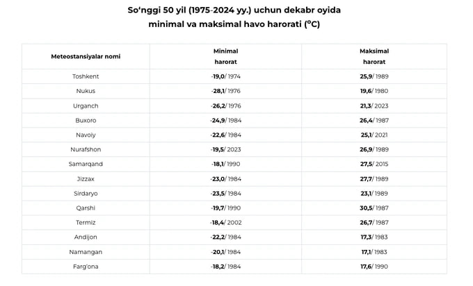 Сўнгги 50 йил ичида 2021 йил декабр ойи энг илиқ (меъёрдан 2–4 даражага юқори) бўлган. Энг илиқ кунларда ҳаво ҳарорати +20…+25 даражагача, жанубда +26…+28 даражагача кўтарилган эди.