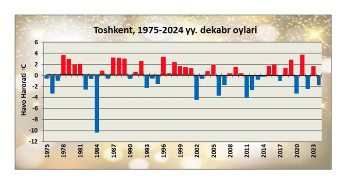 Бу йилги декабр ойида ҳарорат тартиби бўйича ўртача иқлим меъёридан 1−1,5 даража юқори бўлиши кутилмоқда, дея хабар қилди Ўзгидромет.