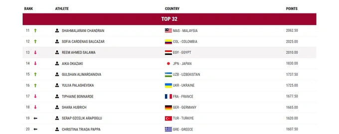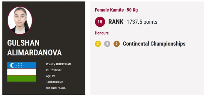 Маълумот учун, WKF рейтингида биринчи ўринни қозоғистонлик Молдир Жангбирбай эгаллаб турибди. Кучли учликни Жазоир ва Италия вакиллари тўлдирган.