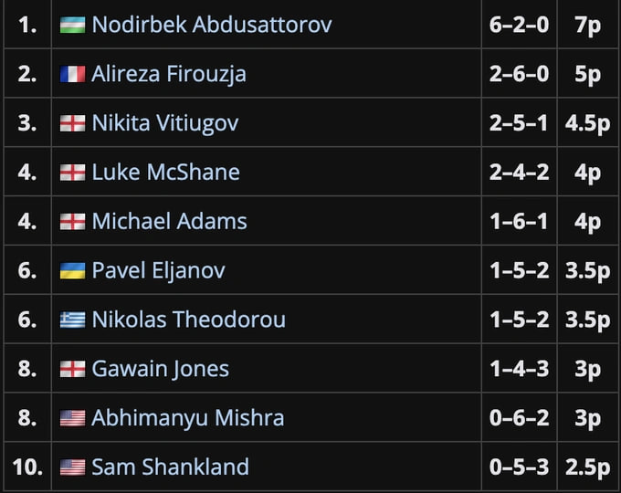 Нодирбек FIDE Жаҳон кубогидаги муваффақиятсиз иштирокидан сўнг 18,4 рейтинг очколарини йўқотганди, London Chess Classic турниридаги ғалабадан сўнг рейтинггини 20 очкога яхшилади ва онлайн жадвалида 22-ўриндан 12-ўринга (2752) кўтарилиб олди.