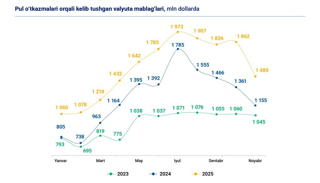 2025 йилнинг январ–ноябр ойларида Ўзбекистонга 17,3 млрд доллар миқдорида пул ўтказмалари келиб тушди. Бу – ўтган йилнинг мос даврига нисбатан 25 фоизга кўп, дея маълум қилди Марказий банк.