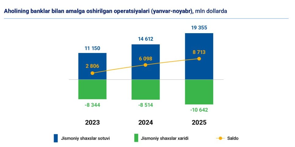 2025 йилнинг 11 ойида жисмоний шахслар томонидан банкларга 19,4 млрд доллар сотилган (ўсиш 33 фоиз) ва 10,6 млрд доллар харид қилинган (ўсиш 25 фоиз).