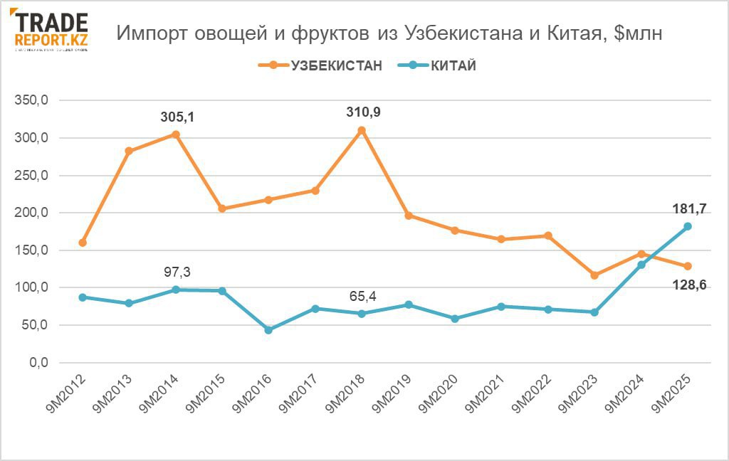 2025 йилнинг 9 ойи якунларига кўра, Қозоғистонга сабзавот ва мевалар етказиб беришда Хитой Ўзбекистонни ортда қолдирди. Ҳисобот даврида қўшни республикага Хитойдан импорт 39 фоизга ошиб, 181,7 млн долларни ташкил этди. Шу билан бирга, Ўзбекистондан етказиб бериш 12 фоизга камайиб, 128,6 млн долларгача қисқарди.