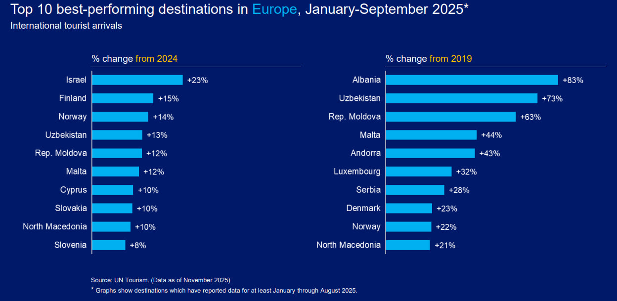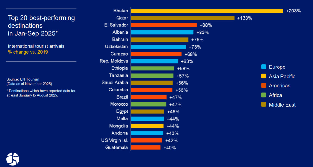 2025 йилнинг январ-сентябр ойлари якунига кўра, Ўзбекистонга халқаро туристлар оқими 2019 йилнинг мос даврига нисбатан 73 фоизга ошган. Бундан яхшироқ натижалар фақат Бутан (+203 фоиз), Қатар (+138 фоиз), Эл Салвадор (+88 фоиз), Албания (+83 фоиз) ва Баҳрайнда (+76 фоиз) қайд этилган.