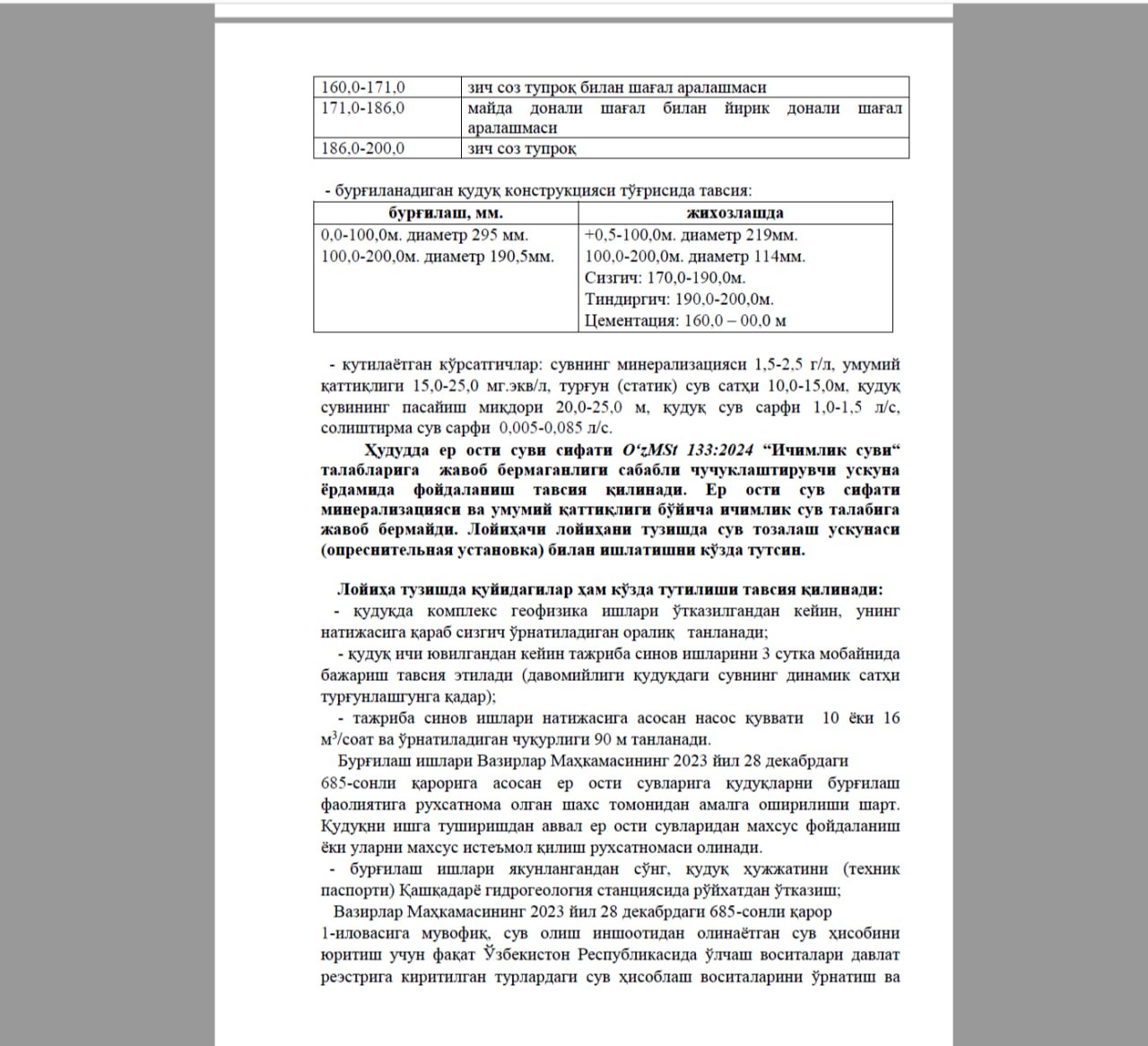 Хулосага кўра, ҳудуддаги ерости суви “Ичимлик суви” стандарти талабларига жавоб бермайди. Минерализация ва умумий қаттиқлик даражаси ҳам ичимлик учун ноқулай. Эътибор қилинг, шу сабабли қудуқдан сув олишда чучуклаштирувчи ускуна қўлланиши, яъни сувни тозалаш орқали фойдаланиш тавсия қилинмоқда. Фақатгина лойиҳачи лойиҳани тайёрлашда масаланинг шу томонларини инобатга олса, кифоя. Шу орқали сув сифати ва хавфсизлигини таъминлаш мумкин бўлади.