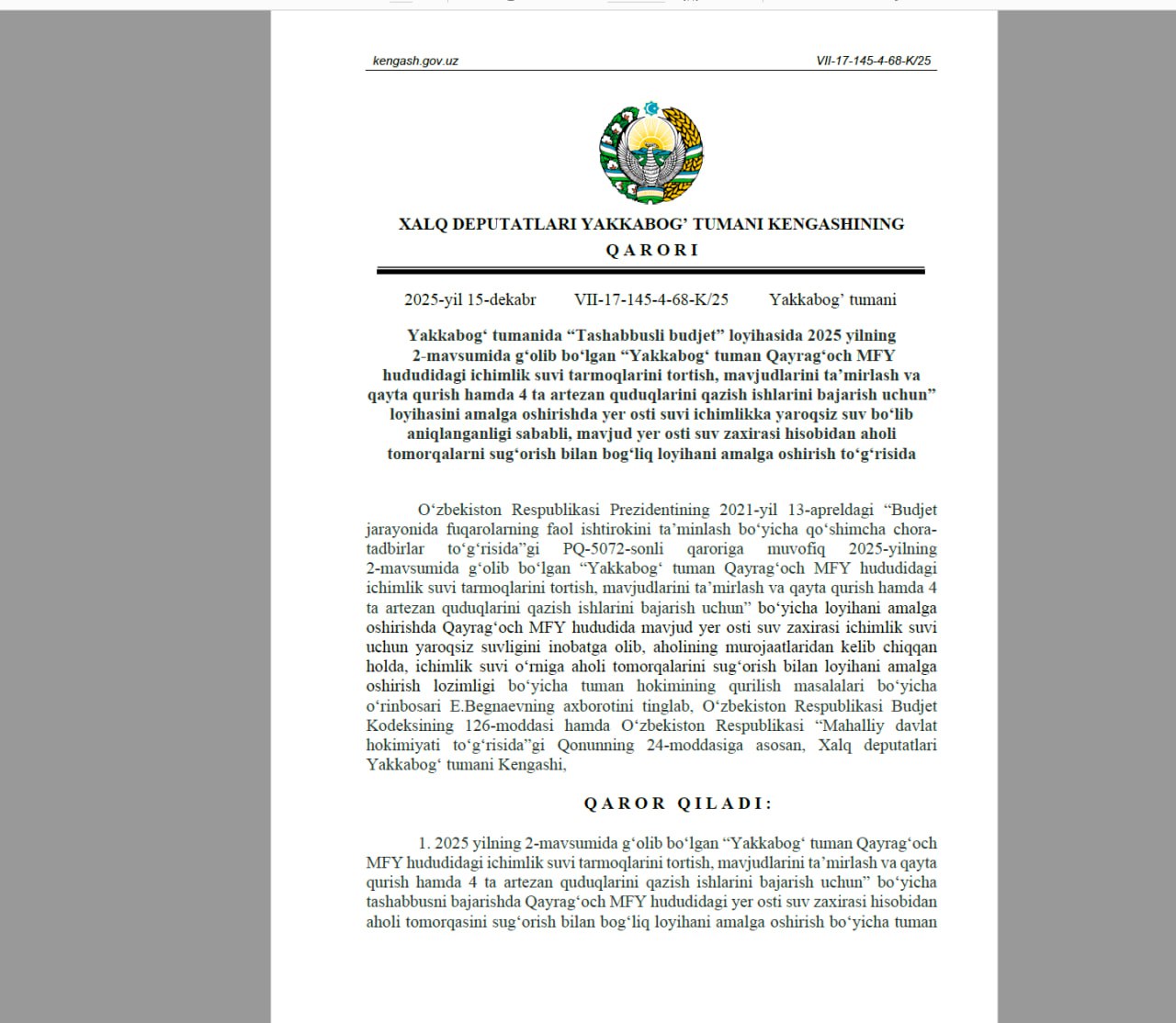 Ниҳоят, маҳалла учун мавжуд сув иншоотларини таъмирлаш ва қўшимча тўртта артезиан қазиш учун 1,5 миллиард сўм ажратиладиган бўлди.