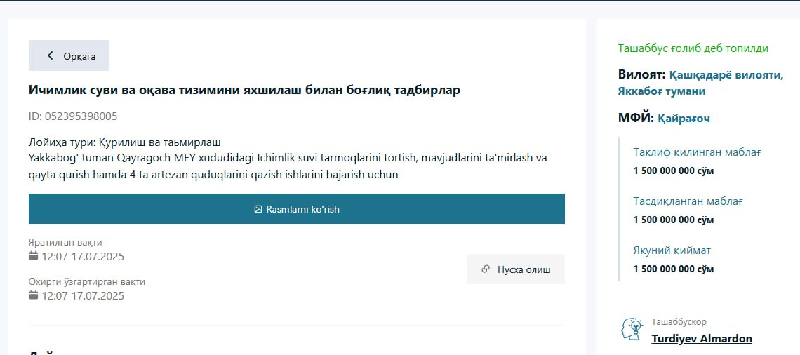 Қашқадарё вилояти Яккабоғ тумани Қайрағоч маҳалласи аҳли 2025 йилда “Ташаббусли бюджет”нинг иккинчи мавсумида ғолиб бўлишди. Улар 4644 та овоз тўплашди.