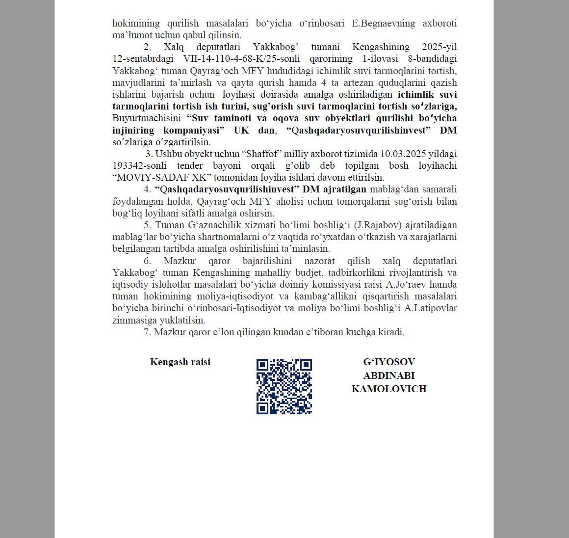 Kun.uz Яккабоғ ҳокимининг қурилиш масалалари бўйича ўринбосари Элбек Бекнаев билан боғланди. Ҳоким ўринбосари ерости суви истеъмолга яроқсиз, шу сабабли ичимлик суви ўрнига аҳолининг таклифини инобатга олиб, томорқасини суғориш учун бошқа лойиҳани амалга оширмоқчимиз. Бу лойиҳани амалга ошириш бўйича Халқ депутатлари туман кенгашининг қарори тайёрланмоқда, деди.