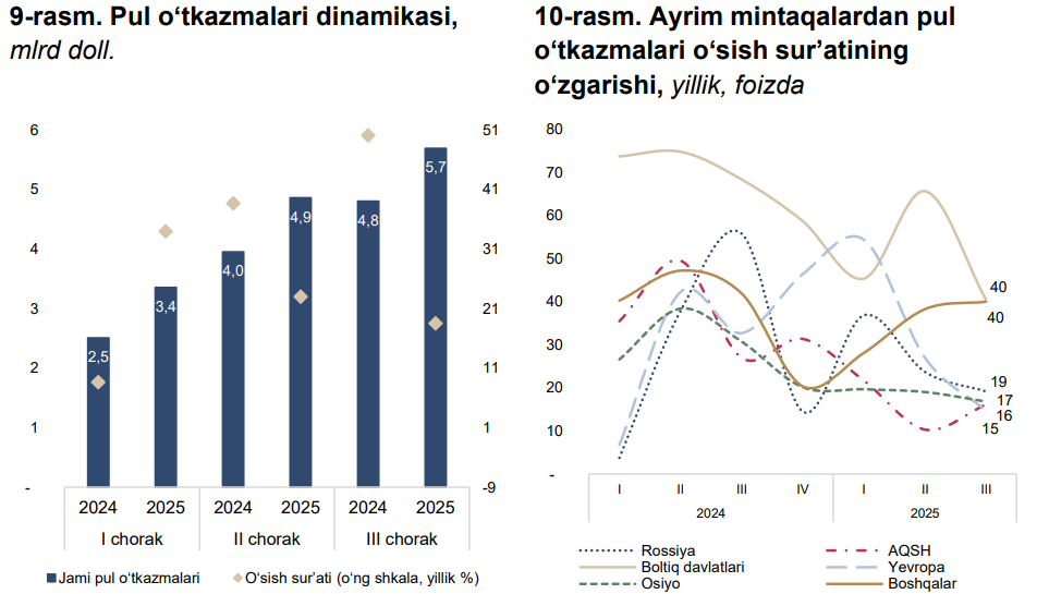 2025 йилнинг июл-сентябр ойларида Ўзбекистонга пул ўтказмалари 5,7 млрд долларни ташкил қилиб, ўтган йилнинг мос даврига нисбатан 18,5 фоиз ўсиш кузатилди. «Жорий динамиканинг шаклланиши асосан меҳнат муҳожирларини қабул қилувчи мамлакатларда валюта курсларининг нисбатан барқарорлиги, иш ҳақининг ошиши ва иқтисодий фаолликнинг юқори суръатлари билан боғлиқ», дейилади Марказий банк шарҳида.