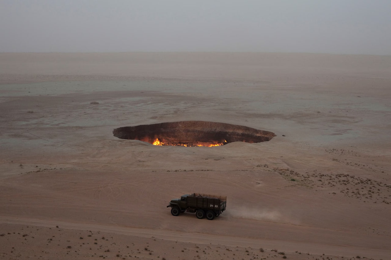 Дарвоза қишлоғи яқинидаги табиий газ кратери 60 йилдан буён ёняпти. Туркманистон президенти уни ўчиришни бир неча бор талаб қилган эди.