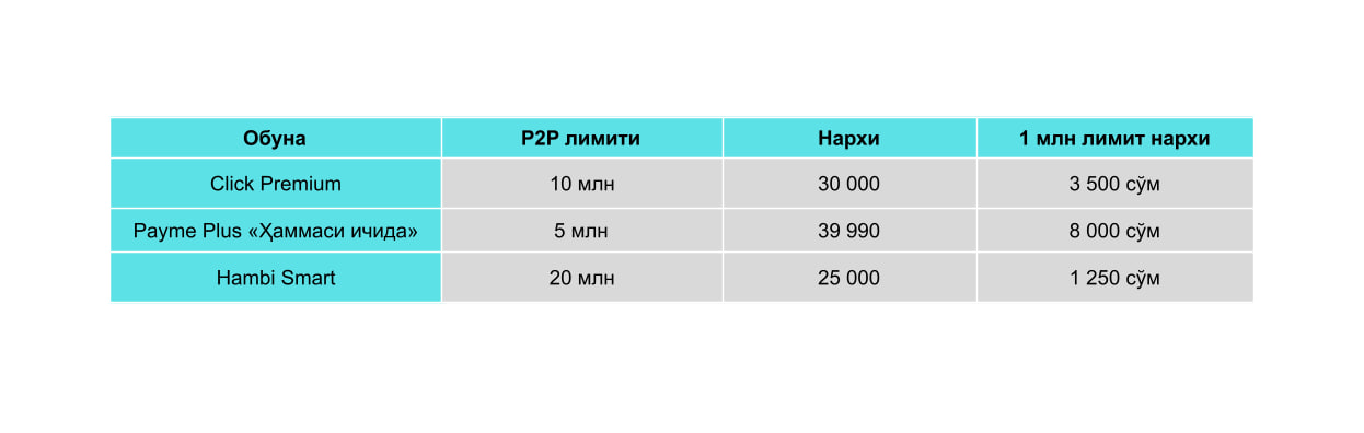 - Payme Plus — ойига 39 990 сўм эвазига «Ҳаммаси ичида» тарифи, 5 млн сўмгача комиссиясиз пул ўтказиш; «Базавий» тарифи ва 4 990 сўмга «Мониторинг» хизмати ҳам бор.