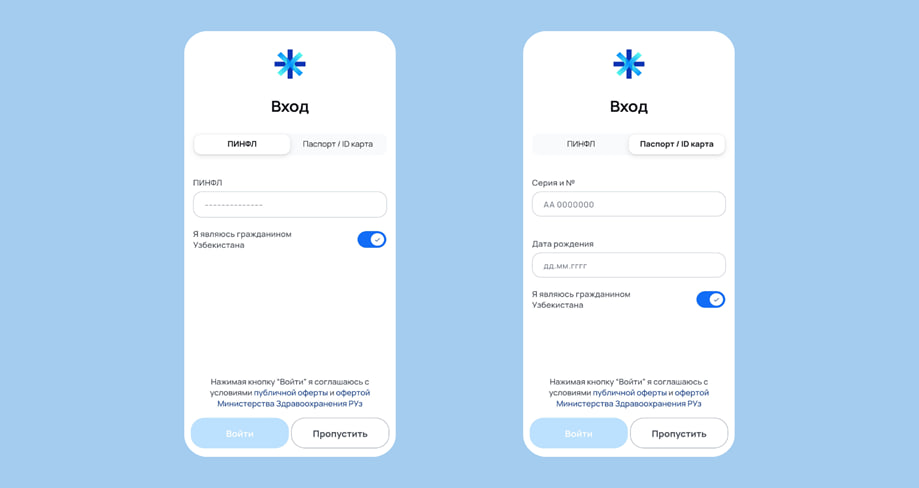 ЖШШИР + Face ID ёки паспорт рақами + телефон рақами орқали иловага киринг.