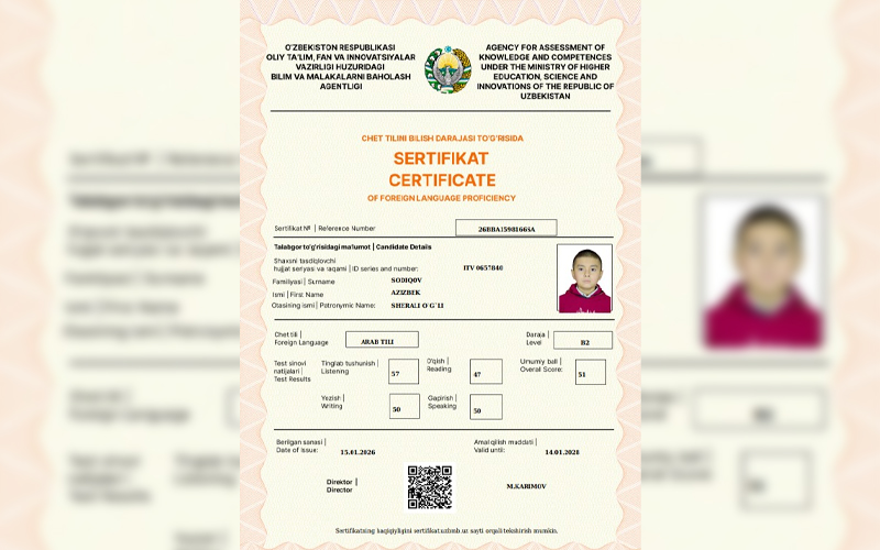 Паркентда 6-синф ўқувчиси араб тилидан B2 сертификатини қўлга киритди
