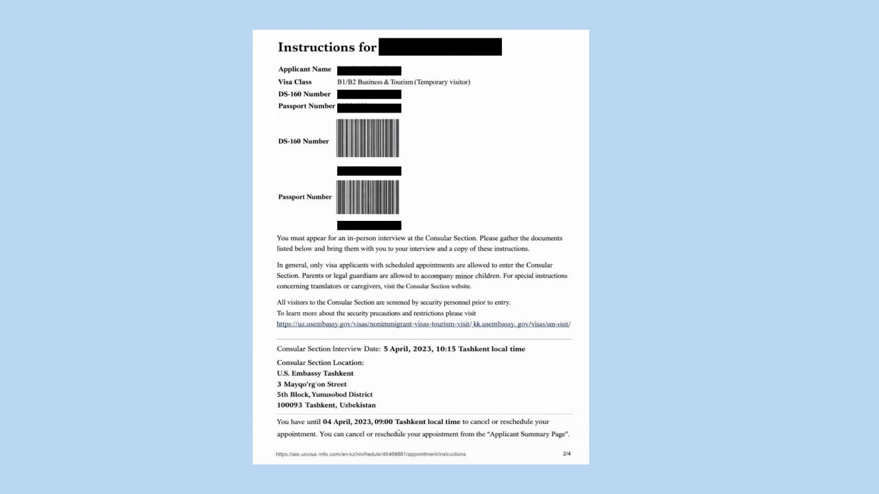 Муҳим: Суҳбатга олиб боришингиз керак бўлган ёзув ҳақидаги тасдиқномани албатта сақлаб қўйинг ва қоғозга чиқариб олинг. Унда исм-фамилиянгиз, паспорт рақамингиз, DS-160 анкетаси рақами ва етказиб бериш тўғрисидаги маълумотлар бўлади.