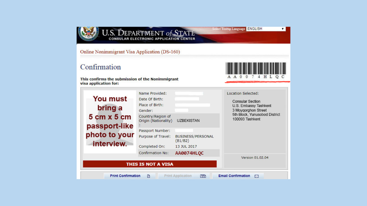 DS-160 (Confirmation Page) тасдиқлаш саҳифаси — унда штрих код ва анкетангиз рақами бўлади. Уни кейинчалик суҳбатга ёзилганда кўрсатасиз.