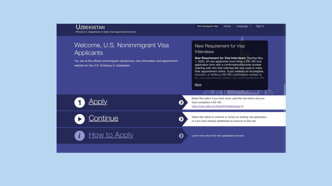 2025 йилдан бошлаб ҳужжат топшириш ва виза бўйича суҳбатдан ўтиш фақат АҚШ элчихонаси мавжуд бўлган фуқаролик мамлакатида амалга оширилади. Бу ҳолатда бутун жараён — қабулга ёзилишдан тортиб суҳбатгача — тегишли элчихонада, Ўзбекистон фуқаролари учун эса АҚШнинг Тошкентдаги элчихонасида ўтади.
