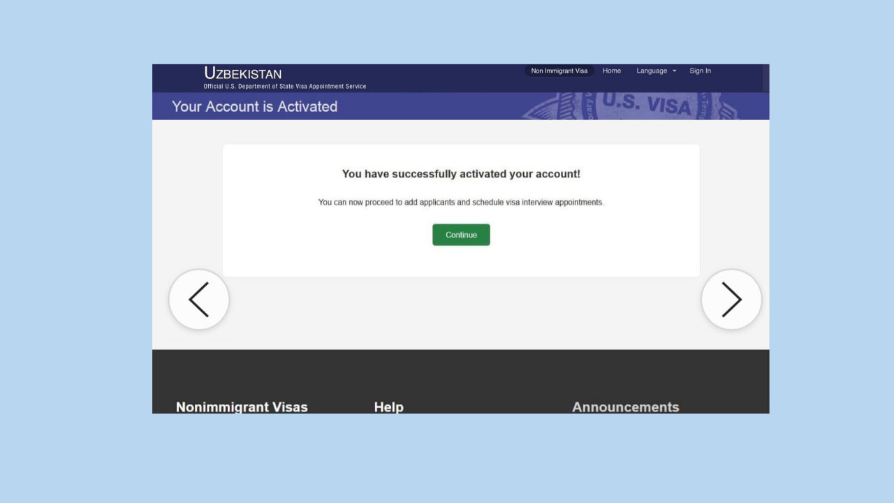 Бунинг учун «Аккаунт яратиш» тугмасини босасиз ва очилган ойнада мос опцияни танлайсиз. «Мен DS-160 шаклини тўлдирдим ва визага ариза бермоқчиман» ёзувини танлайсиз. Сўнгра зарур шахсий маълумотларни киритиш орқали барча майдонларни тўлдирасиз.