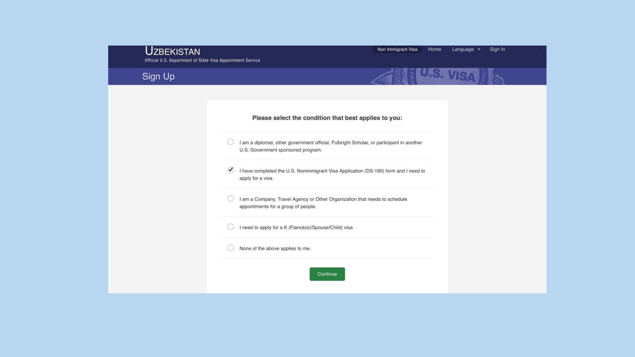 1. Ҳавола орқали ўтинг. Бу визага ариза бериш учун АҚШ Давлат департаментининг расмий сайти. Бу ерда АҚШга ноиммиграцион виза олиш учун DS-160 шакли очилади.