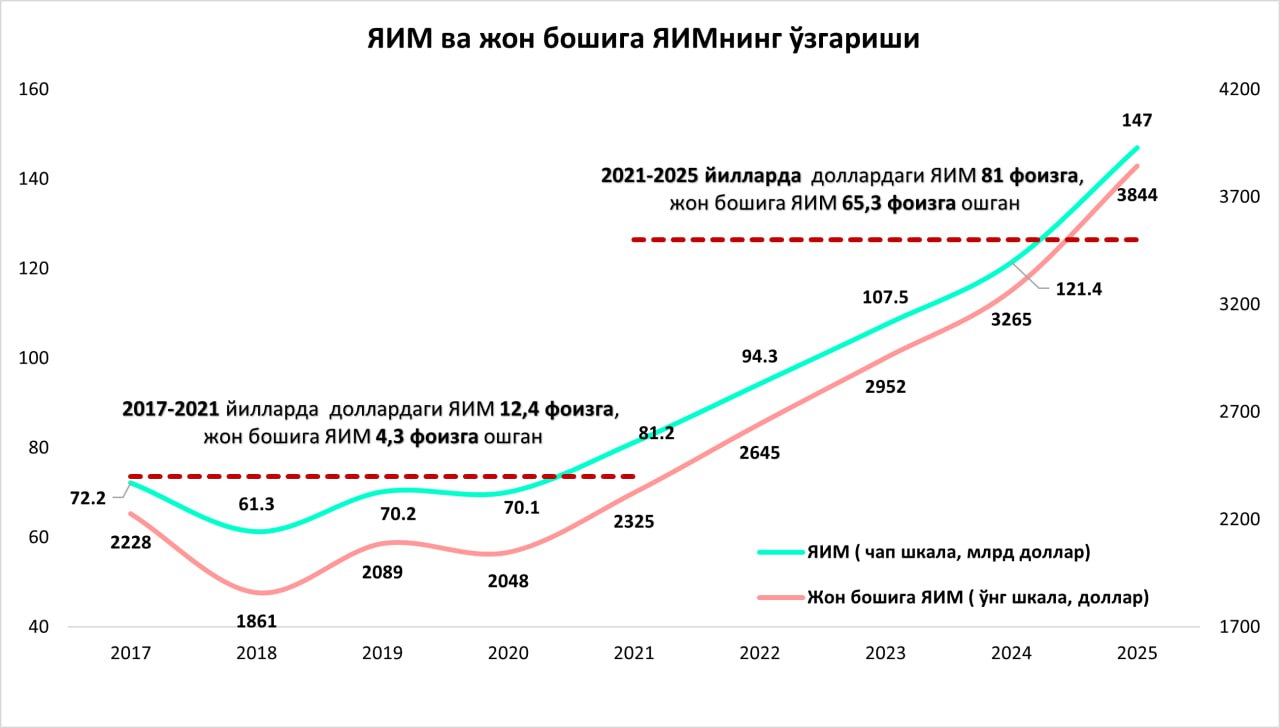 Иқтисодчи Миркомил Холбоевнинг қайд этишича, ўтган йилда доллардаги ЯИМ 21,1 фоизга ўсган ва бу янги давр учун мутлақ рекорд. Таққослаш учун 2024 йилда доллардаги ЯИМ 12,9 фоизга кўпайган. Жон бошида ЯИМ эса барча кутилма ва прогнозларни ортда қолдириб 3844 долларга етган.
