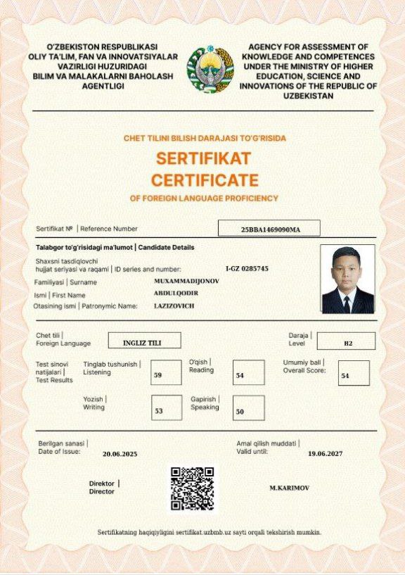 Жиззах вилояти Зомин туманидаги ихтисослашган мактаб ўқувчиси Абдулқодир Муҳаммадижонов 2025 йил ёзида, 11 ёшдалигида чет тилини билиш даражаси бўйича B2 сертификатини қўлга киритган.
