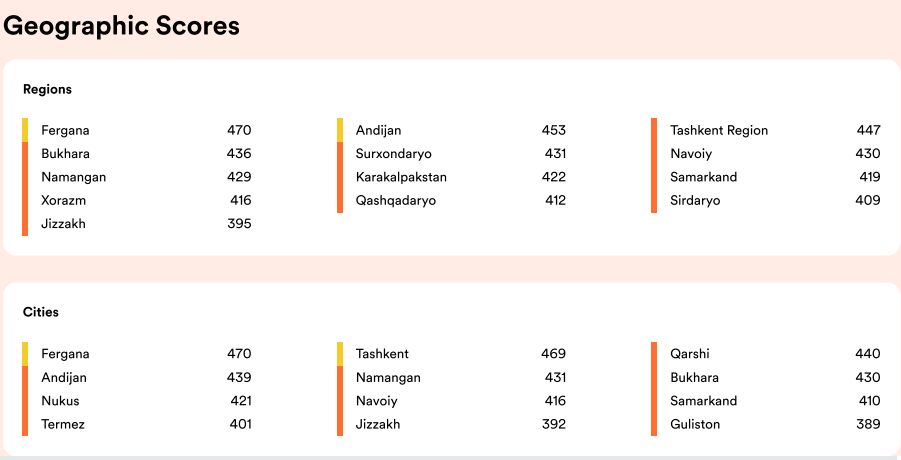 Шаҳарлар миқёсида ҳам Фарғона биринчи ўринда экани эътиборга молик: бу шаҳардан тест топширганларнинг ўртача балли 470 бўлган. Шаҳарлар бўйича топ-бешталикка Тошкент (469), Қарши (440), Андижон (439) ва Наманган (430) кирган.