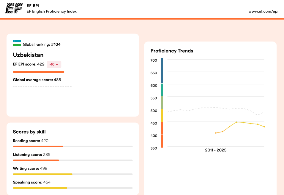 2025 йил учун рейтингда Ўзбекистон 123 та мамлакат орасида 104-ўринда қайд этилган. Бу ўтган йиллардагидан пастроқ: 2024 йилда Ўзбекистон 114 та мамлакат орасида 98-ўринда, 2023 йилда эса 113 та мамлакат орасида 93-ўринда эди. Ўз навбатида, ўзбекистонликларнинг инглиз тилини билиш борасидаги ўртача рейтинг балли ҳам 439 дан 429 гача пасайган (максимал балл – 700). Бу – СEFR шкаласи бўйича Б1 даражага тенг.