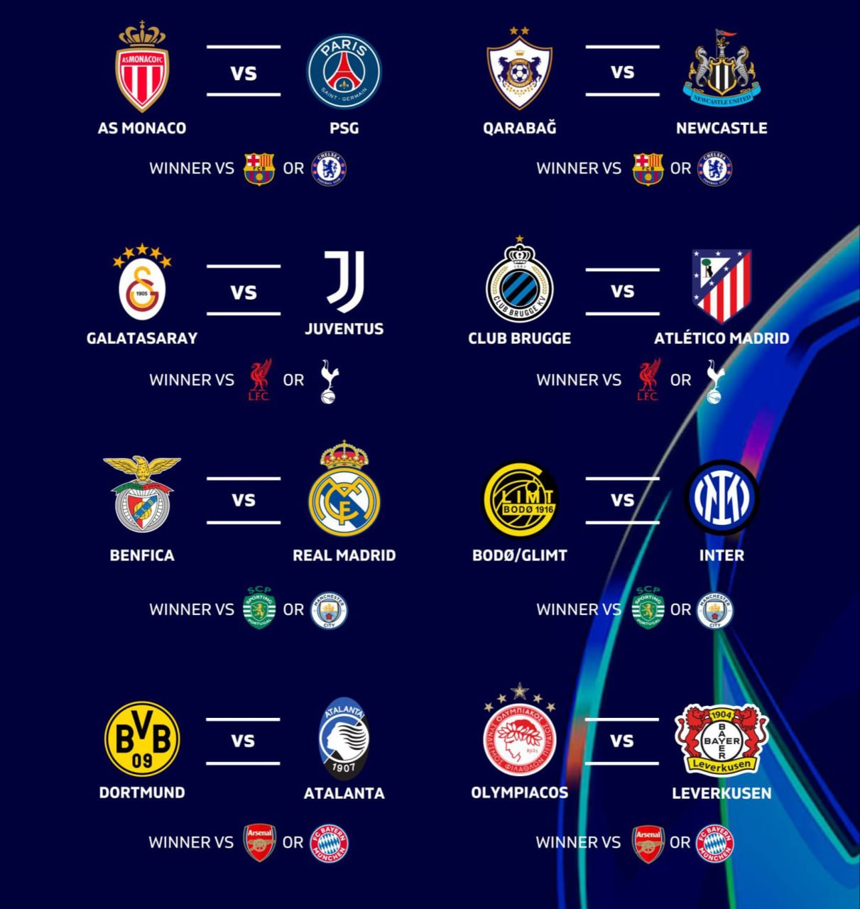 Ўтиш ўйинларида ғолиб бўлган жамоалар 1/8 финалга чиқади, бу босқичда уларни умумий босқичидаги дастлабки саккиз ўринни эгаллаган жамоалар («Арсенал», «Бавария», «Ливерпул», «Тоттенҳэм», «Барселона», «Челси», «Спортинг» ва «Манчестер Сити») кутмоқда. Плей-офф босқичи учун 27 феврал куни алоҳида қуръа ташланади.