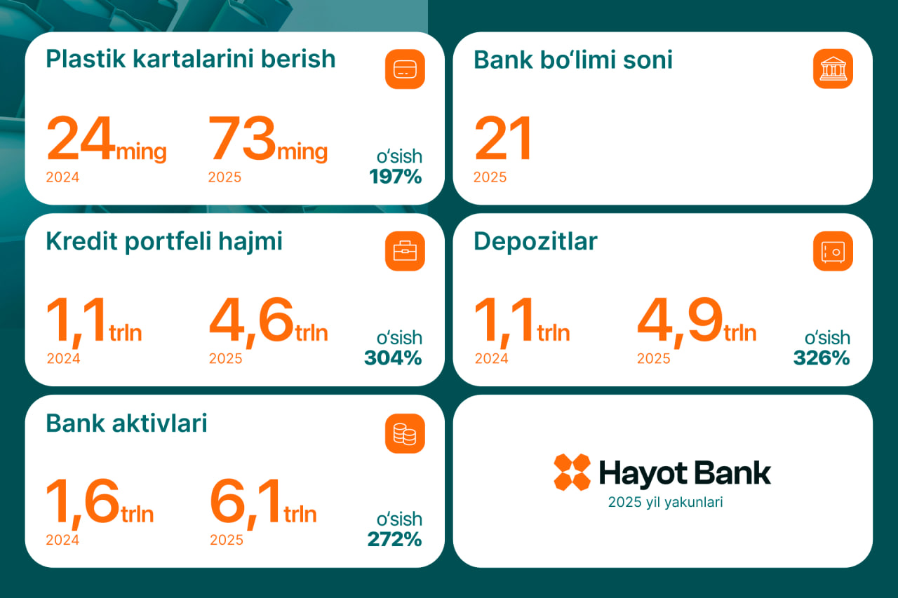 Мазкур натижалар Hayot Bank’нинг ўсиши фақат мижозлар сонининг кўпайиши билан эмас, реал иқтисодий фаоллик ва операциялар ҳажмининг кенгайиши билан боғлиқлигини тасдиқлайди.