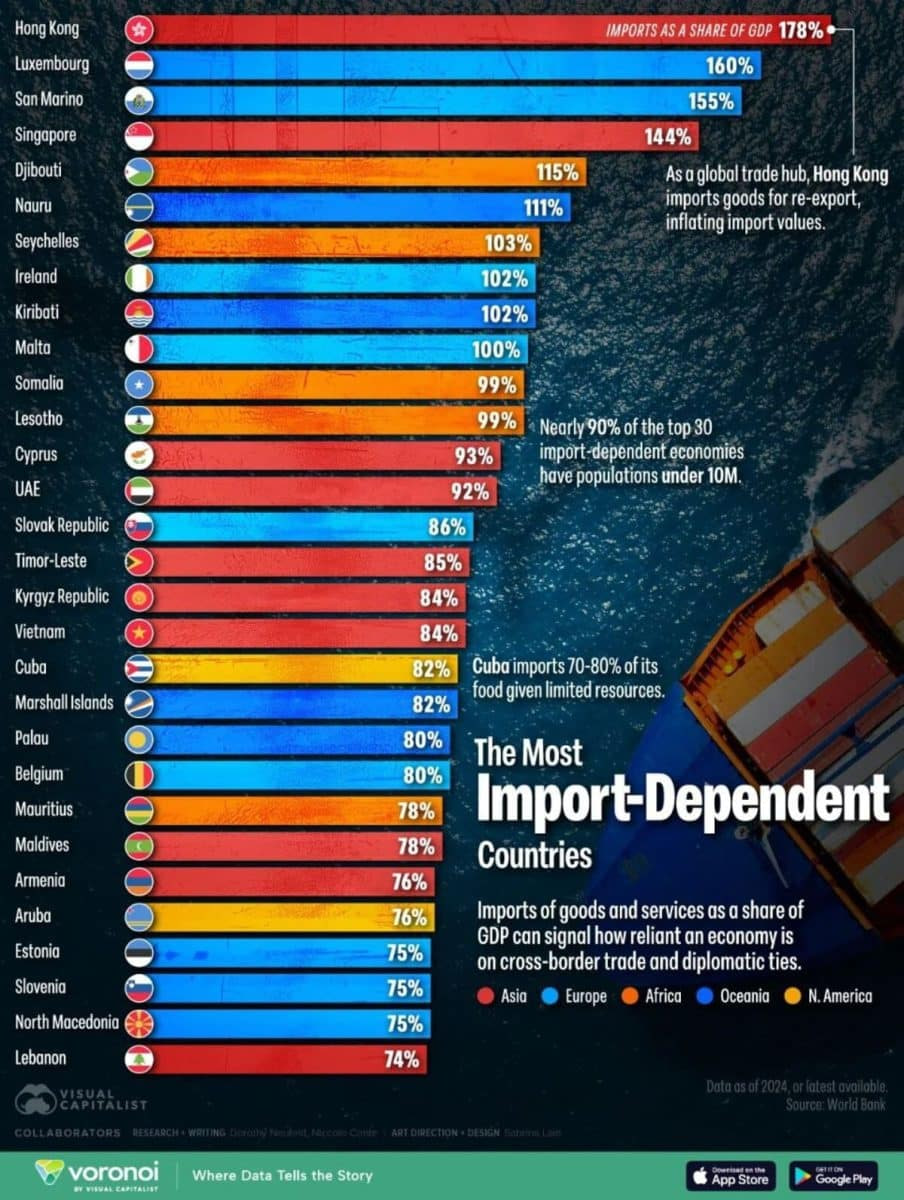 Тақдим этилган инфографикада Жаҳон банки маълумотлари асосида импортнинг ЯИМга нисбати энг юқори бўлган мамлакатлар кўрсатилган. Жаҳон рейтингида Ҳонгконг етакчи бўлиб, бу ерда импорт ҳажми ЯИМнинг 178 фоизини ташкил қилади.