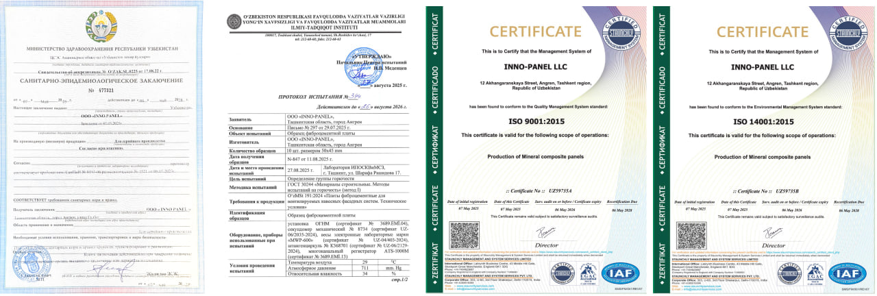 № 344-сонли расмий баённомага кўра, панеллар 750°C ҳароратда ҳам ўз тузилишини сақлайди, ёнишни қўллаб-қувватламайди ва заҳарли тутун чиқармайди.