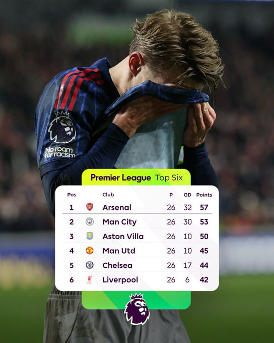 «Арсенал» сўнгги олти турда тўртинчи бор очко йўқотди (3 дуранг ва бир мағлубият). Натижада энди иккинчи ўринда келаётган «Манчестер Сити» билан орадаги фарқ тўрт очкогача қисқарди. Мавсум якунига ҳали 12 тур бор, лекин чемпионлик масаласи катта эҳтимол билан апрел ойида ушбу жамоаларнинг ўзаро ўйинида ҳал бўлади.